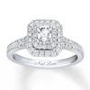 Dazzling rows of round diamonds surround a spectacular radiant-cut diamond center to create the main attraction in this stunning bridal. The 14K white gold band of the engagement ring and matching wedding ring gleam with twinkling diamonds, bringing the total diamond weight of the bridal set to 1 1/8 carats.