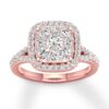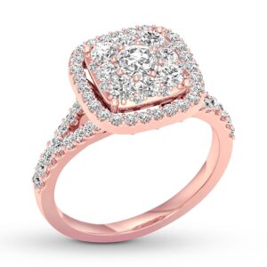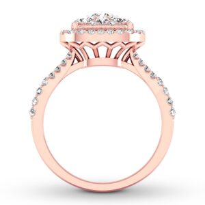 For an everlasting love, never-ending sparkle. Awash in round diamonds, this extraordinary engagement ring is crafted of 14K rose gold. The ring has a total diamond weight of 3/4 carat.