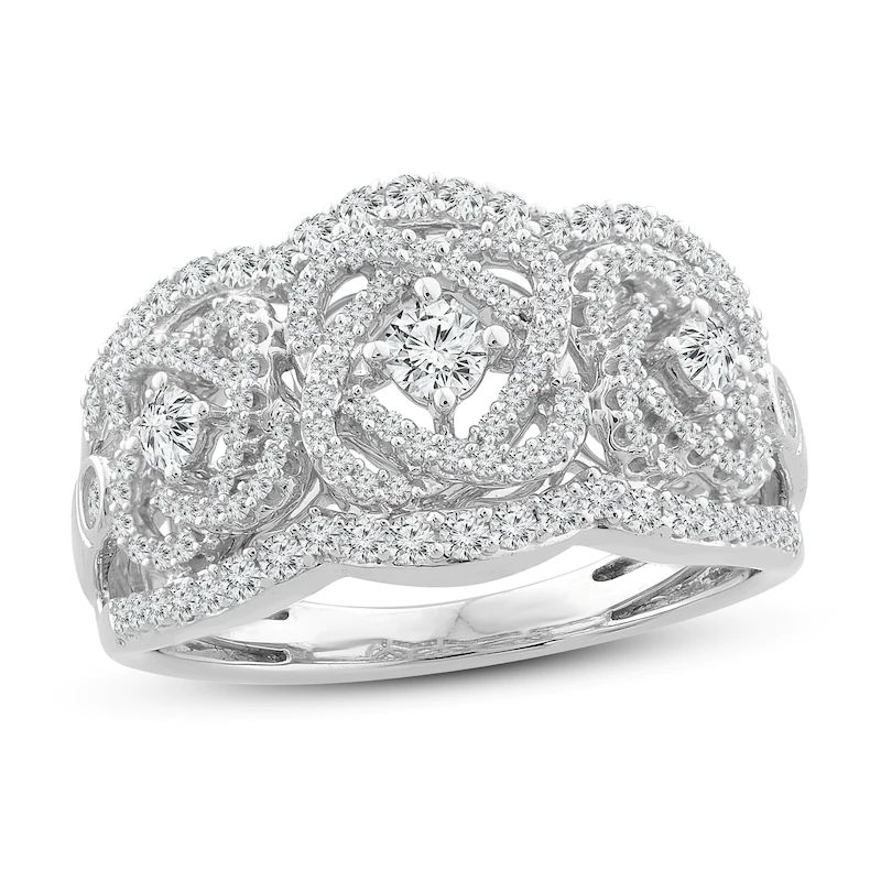 This extraordinary diamond ring for her features a unique interwoven design to symbolize the strength of love and keeping you centered. The design repeats throughout the band, embellished with sparkling round diamonds. A row of brilliant round diamonds line the top and bottom of the ring for a total diamond weight of 3/4 carat. The ring is fashioned in 10K white gold.