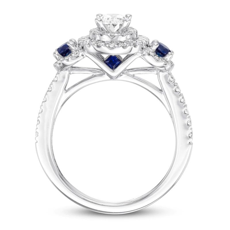 Exquisitely styled, this engagement ring features a 1/2-carat oval diamond center traced in two rows of round diamonds, and flanked on either side by round natural sapphires, symbols of purity. Additional round diamonds line the band, while princess-cut sapphires enliven each profile to complement the design. Crafted of 14K white gold, the ring has a total diamond weight of 1 carat.